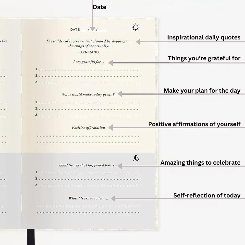In this section, you can document various topics such as things to celebrate and self reflection of the day. Aimed to end your day the right way.